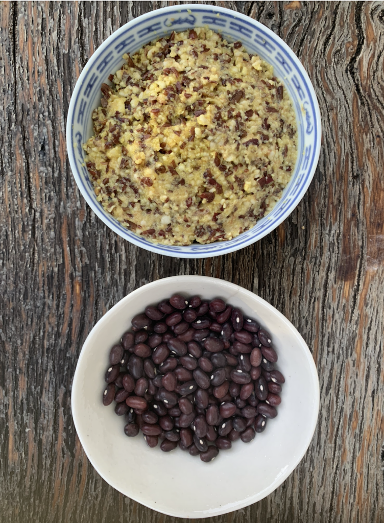 - Wie man sieht, ist die konzentrierte Bohnenmilch kompakter als die Kichererbsenmilch. Bevor man sie im Mörser presst, empfiehlt es sich, sie mit einem Holzlöffel umzurühren, um das Filtern zu erleichtern.