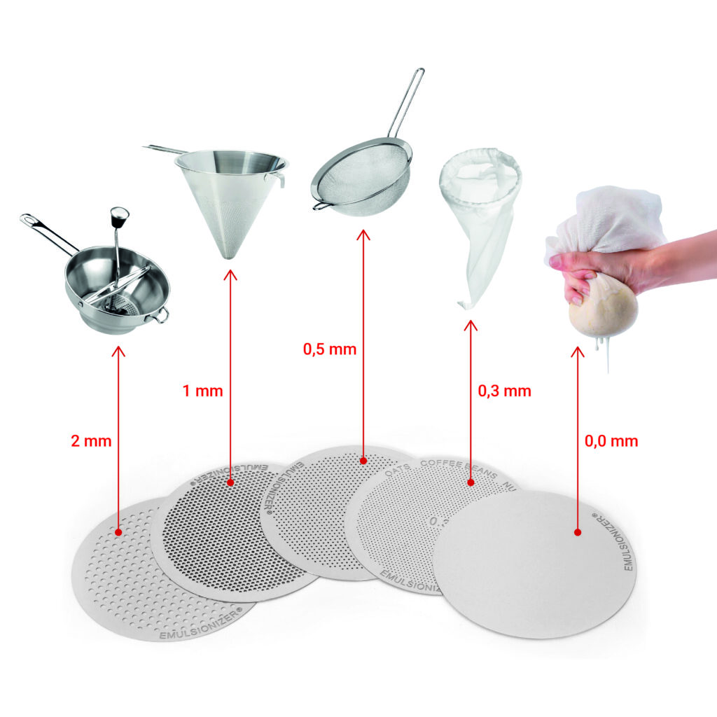 Gracias a su tecnología de discos intercambiables y con la ayuda de una batidora manual ofrece un control total sobre la textura y consistencia de cualquier preparación, sin necesidad de múltiples utensilios. Decimos que es un 5 en 1, porque filtro el filtro Emulsionizer hace la tarea de las 5 modalidades de filtros tradicionales existentes en el mercado.