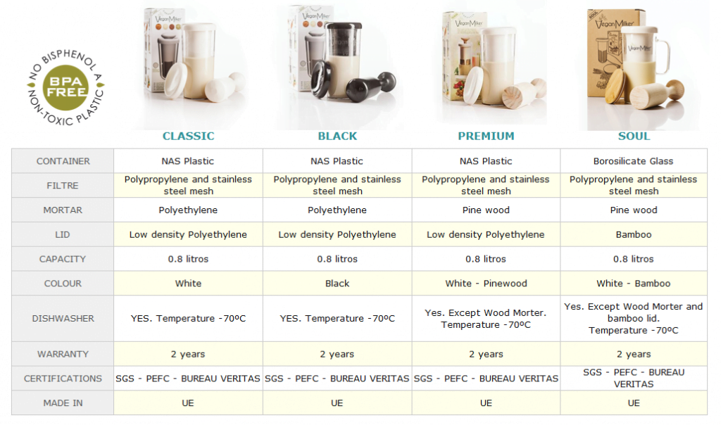 The photo below is a useful table that summarizes in a simple pic the main differences between the 4 Vegan Milker versions. In this table, you can consult the type of materials used in the manufacture, capacity, colors, etc.