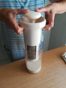 In Africa, we learned a famous saying: Hurry kills. Some people, who use Vegan Milker, after making the drink, may turn the filter glass upside-down and hit it, with a dish or a bucket, to take out the pulp quickly. The filter glass is the most important part of Vegan Milker, thus we advice you to treat it carefully, and to take out the pulp with a wooden spoon, as it is shown in the picture.