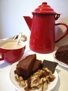 Ci beviamo una tazza di latte di noci caldo con un goccio di caffè o cereali e lo prendiamo insieme al dolce delizioso fatto a casa. Buon appetito!