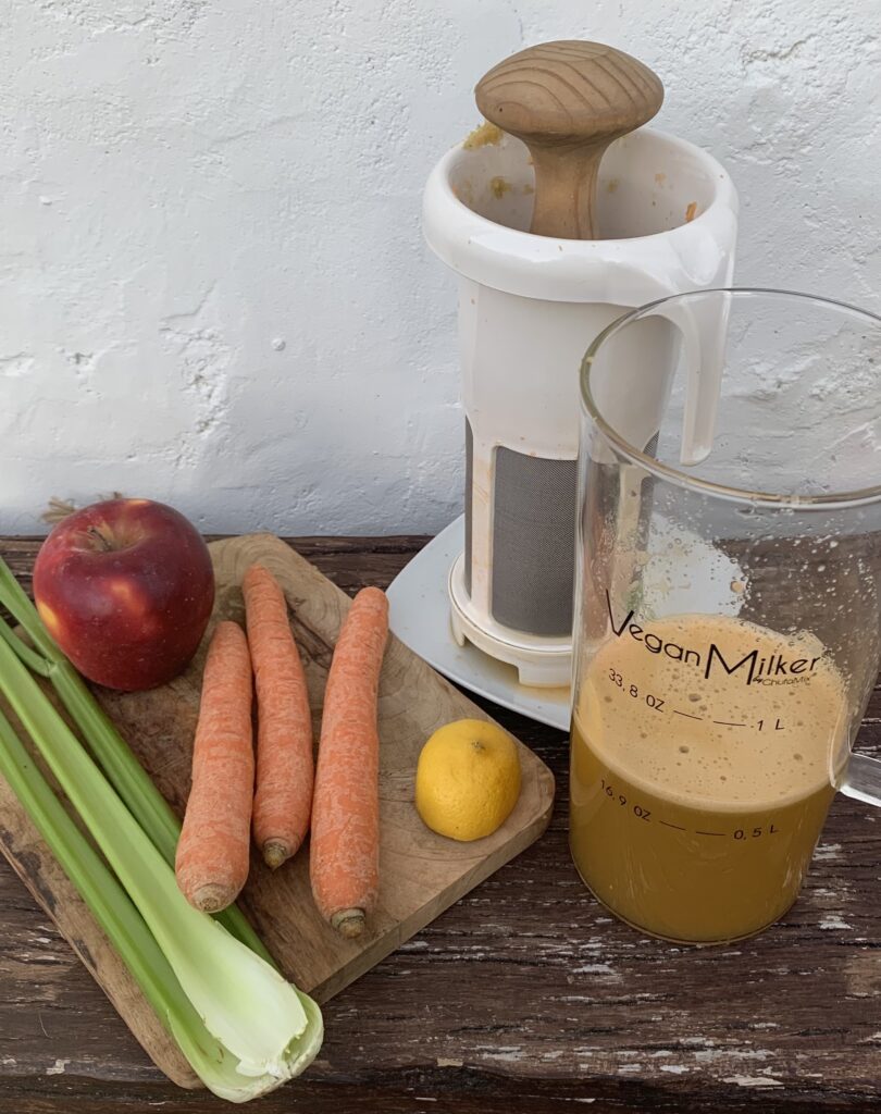 Con questi tre ingredienti di base, il classico frullatore a mano e il Vegan Milker prepareremo un succo depurativo facile e veloce. Ecco a voi!