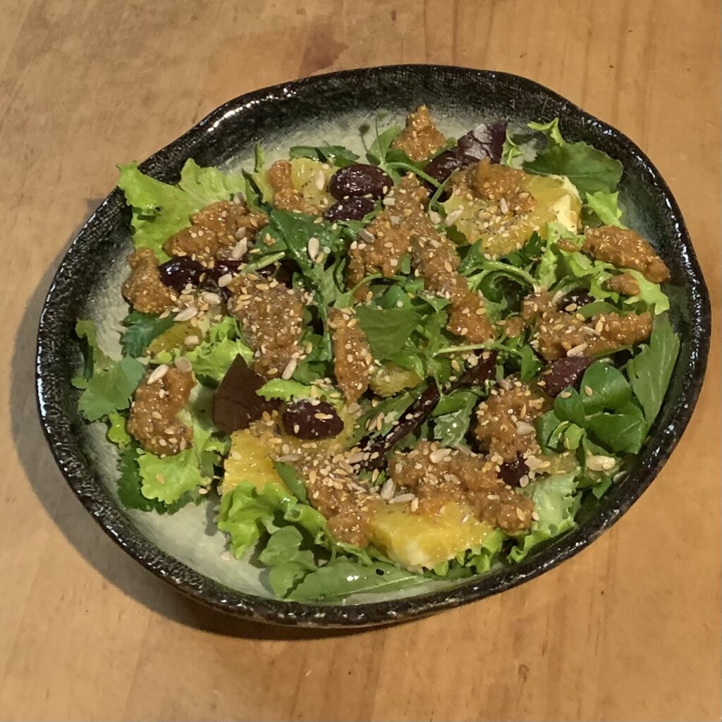L’insalata nella foto è composta da verdure invernali: scarola, lattuga, foglie di barbabietola, tarassaco, rucola e cerastio, qualche pezzo d’arancia e alcune olive nere. Aggiungendo la nostra vinaigrette del riciclo e una guarnizione di semi o noci assortiti, diventerà un piatto delizioso e super nutriente. Salute!