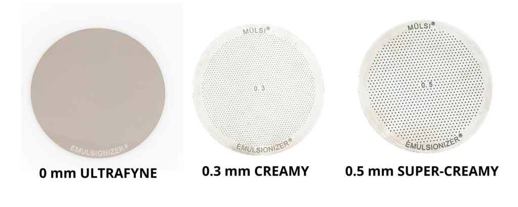 El disco 03 mm – Creamy: el diámetro de los agujeros de este disco coincide con la malla lateral del filtro de los modelos Mulsi y Emulsionizer. Es el tamaño ideal para preparar leches vegetales y combinaciones de café utilizando el café en grano (sin moler) como una semilla más.