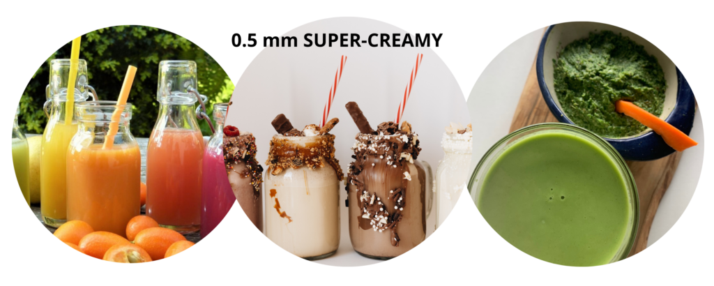 El disco 05 mm – Supercreamy: es el que tiene los agujeros más anchos Y por ende con el que conseguiremos una bebida más espesa, concentrada o cremosa. Este disco es perfecto para preparar batidos, gazpachos, sopas y zumos de fruta o de verdura.