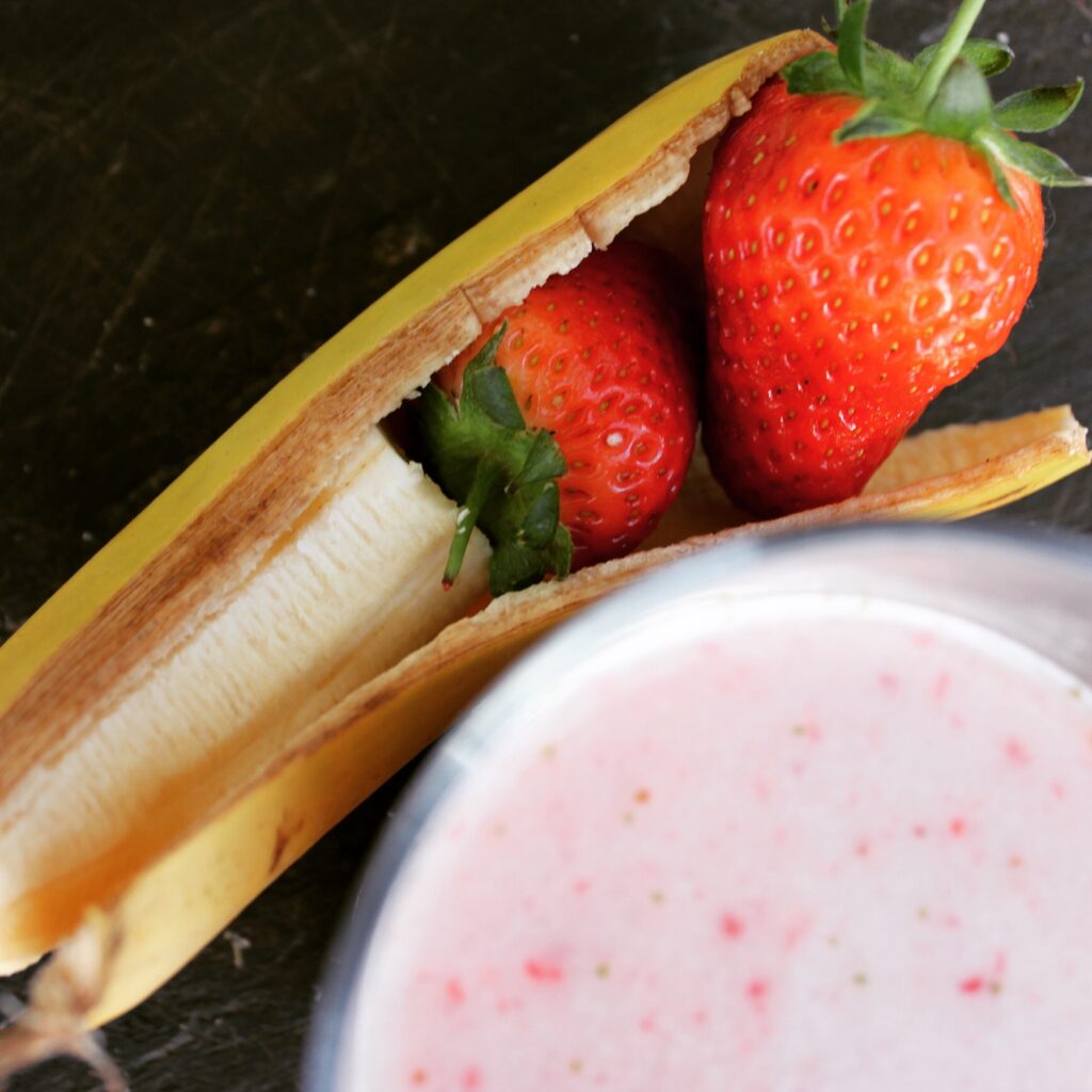 4. Quitar el filtro. Añadir el plátano y las fresas (o 400 g de otra fruta que nos guste más) y batir otra vez.